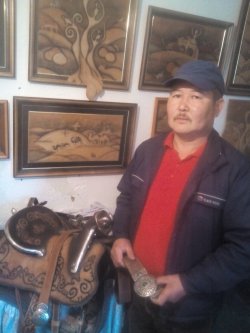 : Караколдук уста М.Меңдулатов териге сүрөт түшүрүп, ээр чабат жана ат жабдыктарды жасайт (